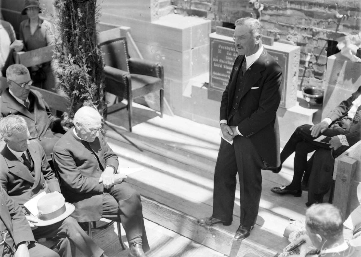 Lord Stonehaven speaking at the Foundation Stone laying ceremony at Presbyterian Church of St Andrew, State Circle, Forrest.
